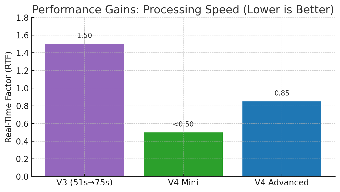 - Mini: RTF < 0.5× (up to 3× faster than V3)